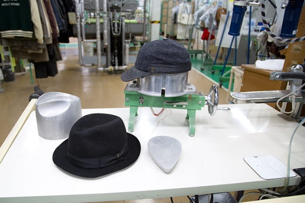 様々な形をした帽子は、型崩れをさせないため1点ずつ手洗いを行っています。洗い後は帽子の形に合わせ金属もしくは生地でできている型にはめて乾燥し、専用の特殊な仕上げ機で蒸気をかけてシワを消します。