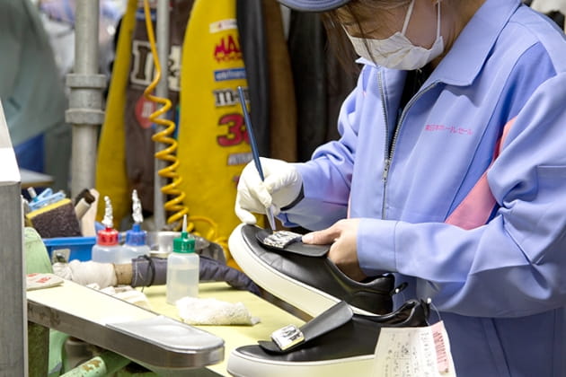 専用の洗浄機を使い洗い上げます。また、素材や品物によって手洗いも行います。乾燥時にはシューズキーパーで成型し殺菌消臭が出来るオゾン殺菌乾燥機で乾燥いたします。さらにスレなどの色補正やリ・カラーも可能です。